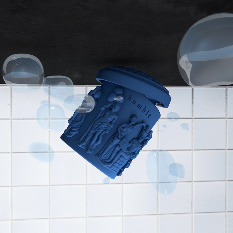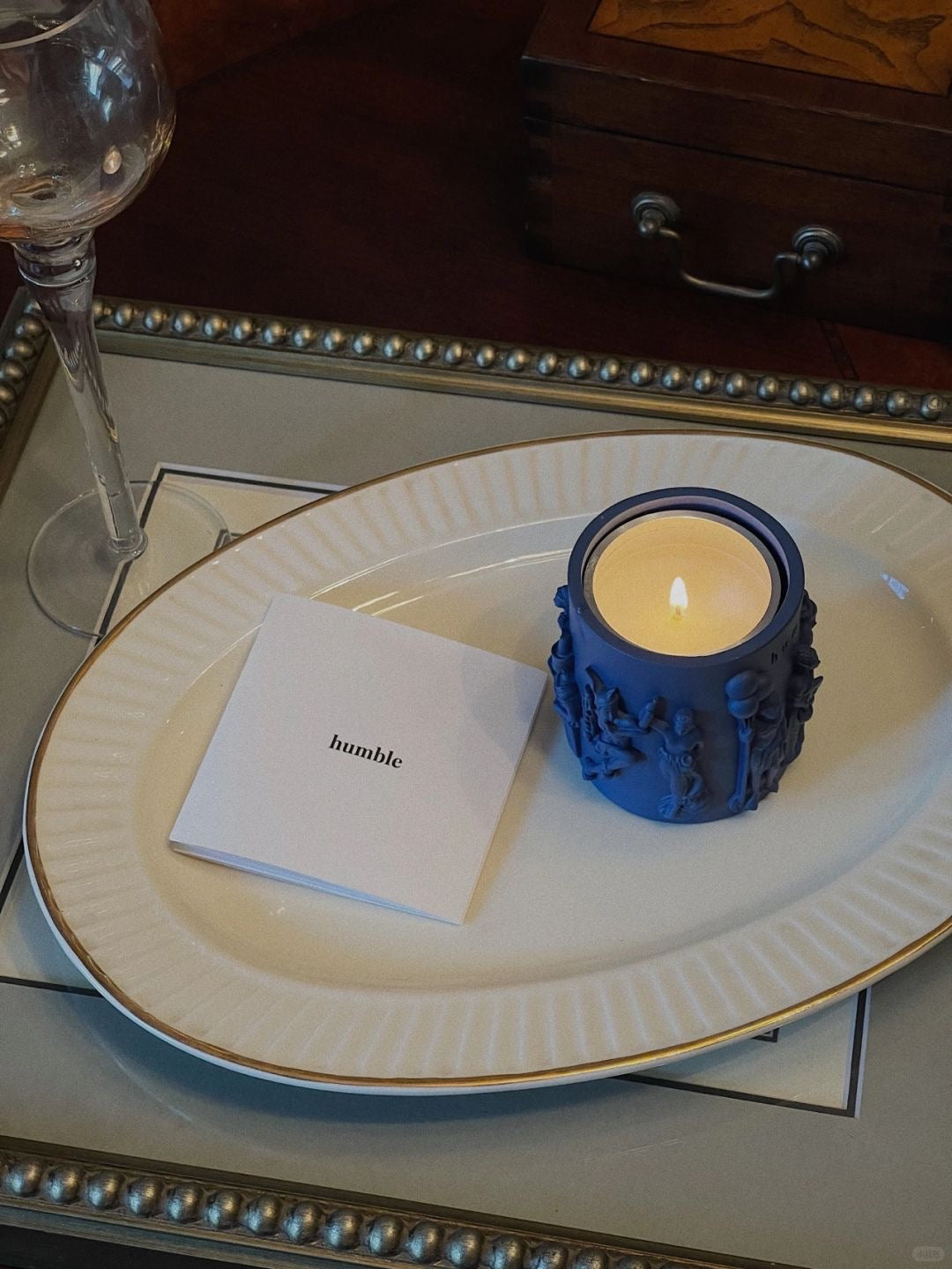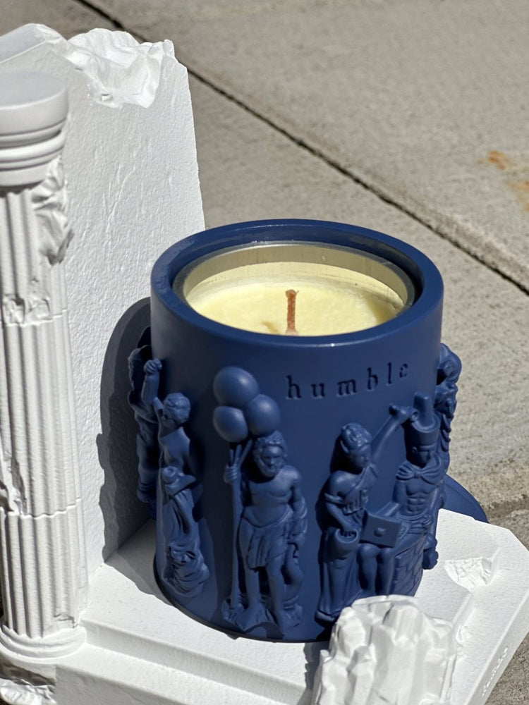 - Humble candle features statues of gods with contemporary significance, reminiscent of ancient Greek temple remnants. It beautifully blends a historical atmosphere with modern elements.