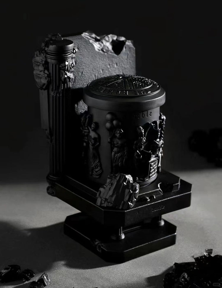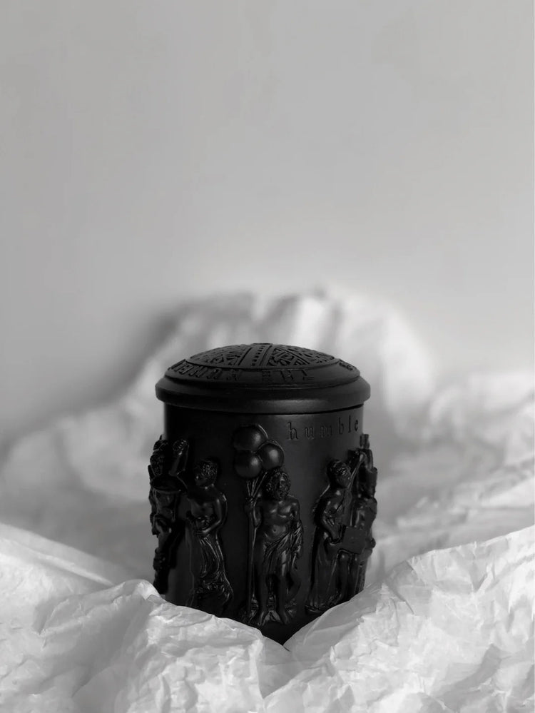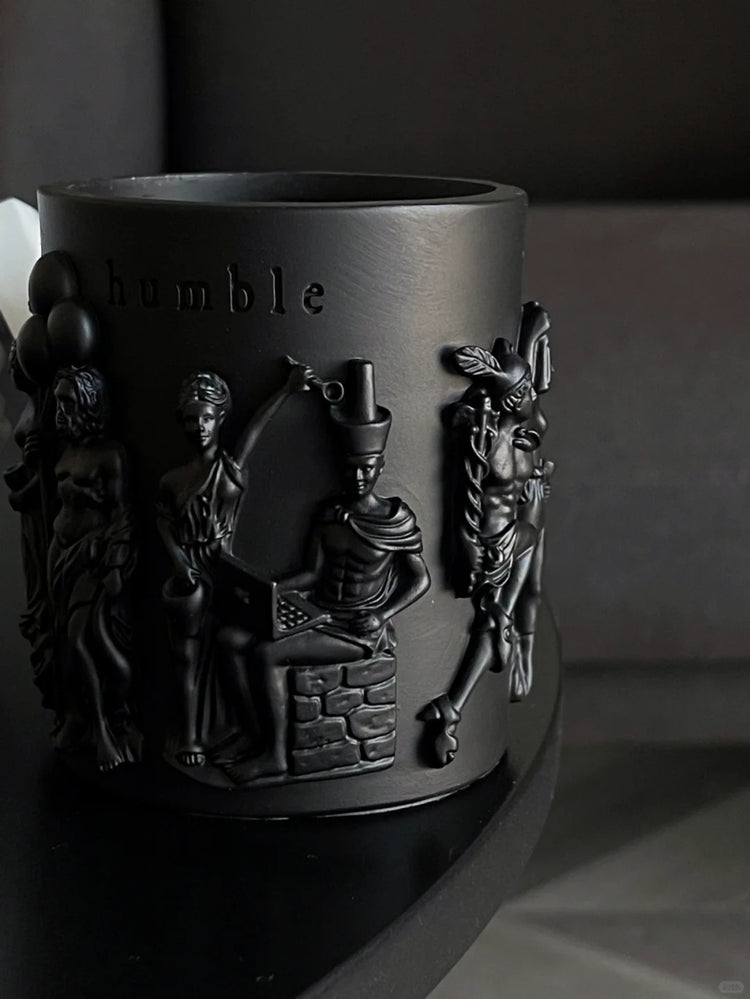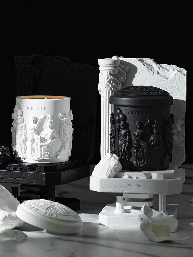 - Humble candle features statues of gods with contemporary significance, reminiscent of ancient Greek temple remnants. It beautifully blends a historical atmosphere with modern elements.